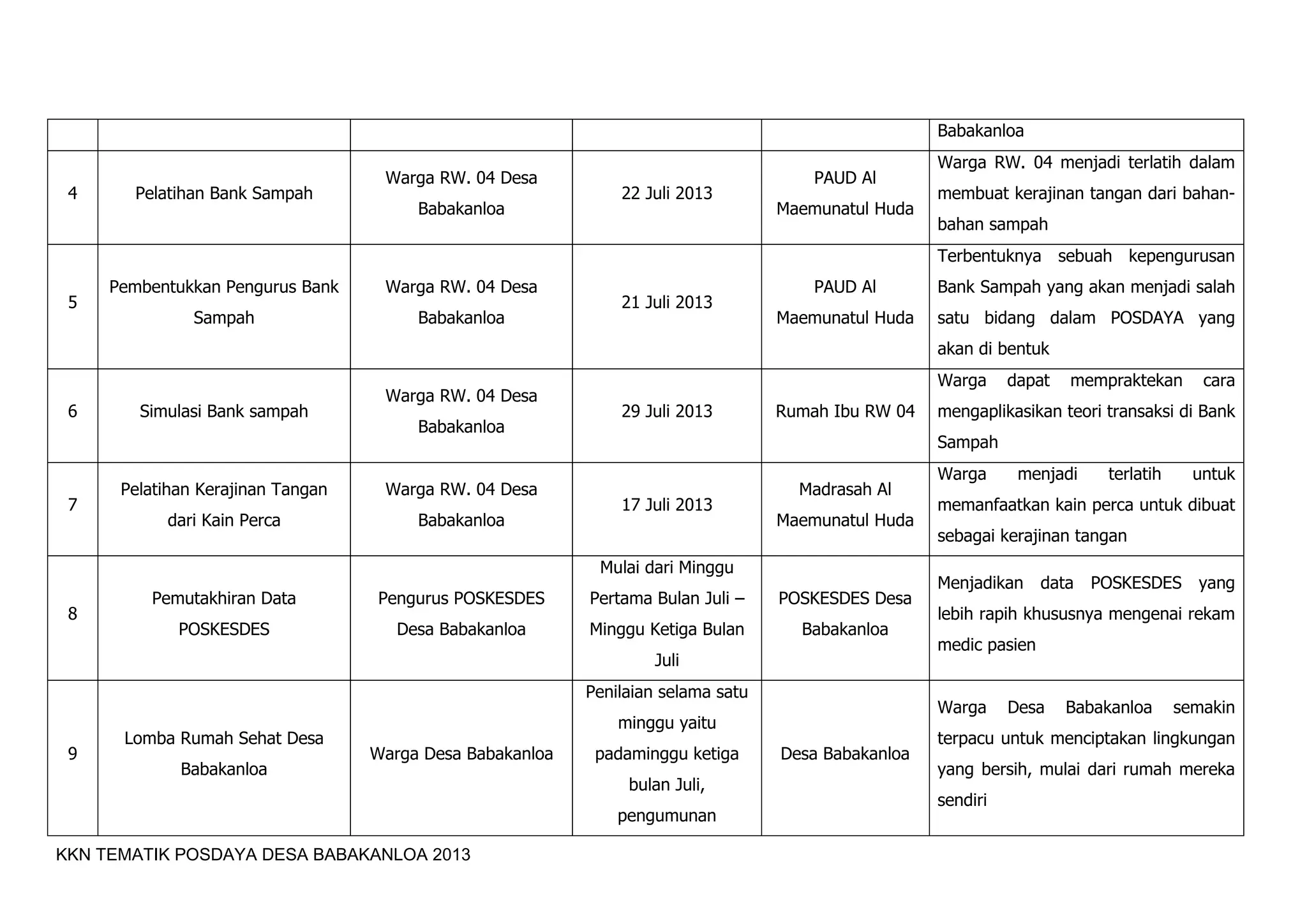 Program Kerja KKN Tematik Posdaya Desa Babakanloa 2013 meliputi berbagai kegiatan seperti sosialisasi Posdaya dan bank sampah, pelatihan kerajinan tangan dan bank sampah, pembentukan pengurus bank sampah, bimbingan belajar, mengajar di sekolah dan madrasah, lomba untuk siswa SD, dan partisipasi dalam kegiatan masyarakat seperti di Poskesdes dan kerja bakti.