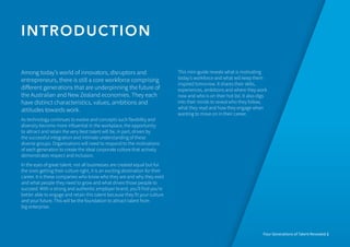 The document explores the distinct characteristics, values, and career aspirations of four generations of the workforce in Australia and New Zealand, emphasizing the need for organizations to create inclusive corporate cultures that respect the motivations of each generation. It highlights trends in employment preferences, job functions, and skills across different generations, revealing insights into what attracts and retains talent. Furthermore, it underscores the growing importance of work/life balance, challenging work, and a strong employer brand in engaging today's workforce.