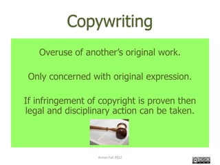 The document discusses copyright, plagiarism, and fair use. It provides a brief history of copyright law originating in 1789 and outlines what types of works are protected (literary, artistic, etc.) and unprotected (government works). It discusses how licensed works from libraries can be used within copyright law and how the implied license of the internet allows sharing if credit is given. Fair use principles are explained as using limited portions of a work for purposes like criticism or news reporting. Commercial use requires permission from the copyright owner.