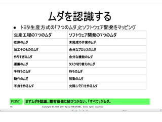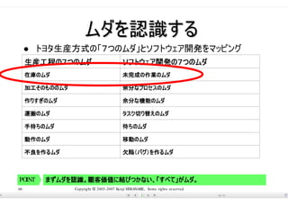 担当の配分はどうだったか? • Problemに対する効率的な対応は? • なにが見える化できていたか? • 工程の壁がなくなったら? • 自分の職場で活かせるポイントは? • このまま適用できないのはどこか?