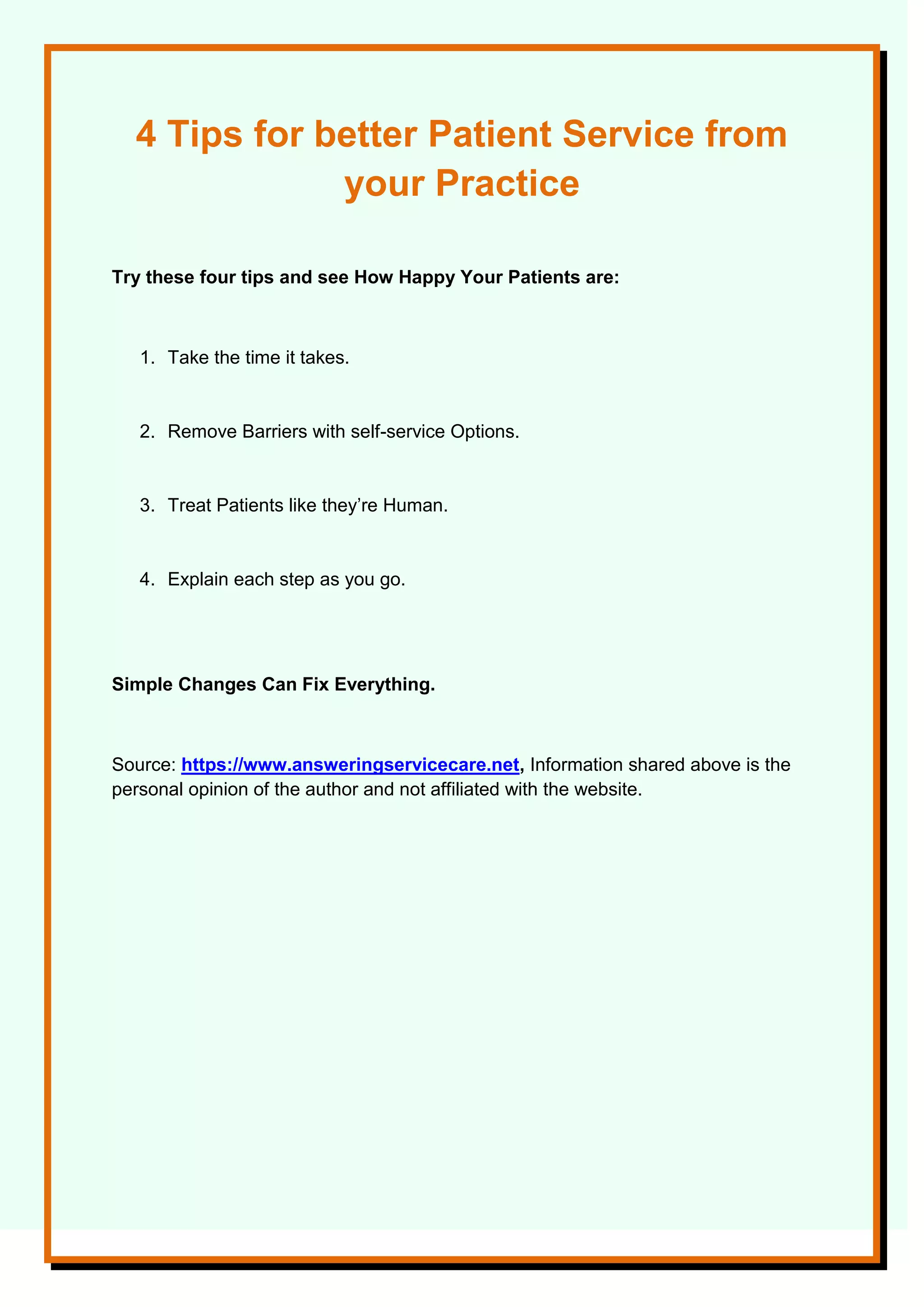 The document provides four tips to enhance patient service, including taking adequate time for patients, offering self-service options, treating patients with humanity, and explaining processes clearly. Implementing these simple changes can significantly improve patient satisfaction. The author's insights are personal opinions and not officially affiliated with the cited website.