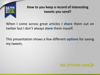 2) Diigo is a bookmarking tool that can automatically save favorited tweets and their links. It can tag these bookmarks as coming from tweets.