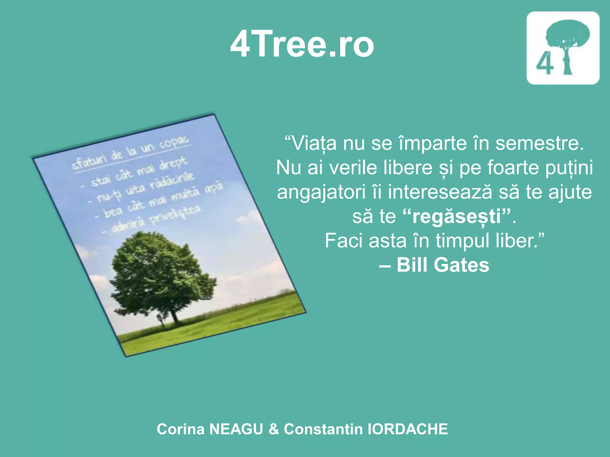 Documentul subliniază importanța găsirii unui loc de muncă și sprijinul oferit de 4tree.ro, care include servicii de consiliere în carieră, coaching și formare de abilități soft. Este evidențiată filozofia de a depăși limitele mentale și de a crede în visele personale, promovând dezvoltarea personală și profesională. Corina Neagu și Costel Iordache, parteneri ai companiei, aduc o experiență vastă în domeniul resurselor umane și al business-ului.