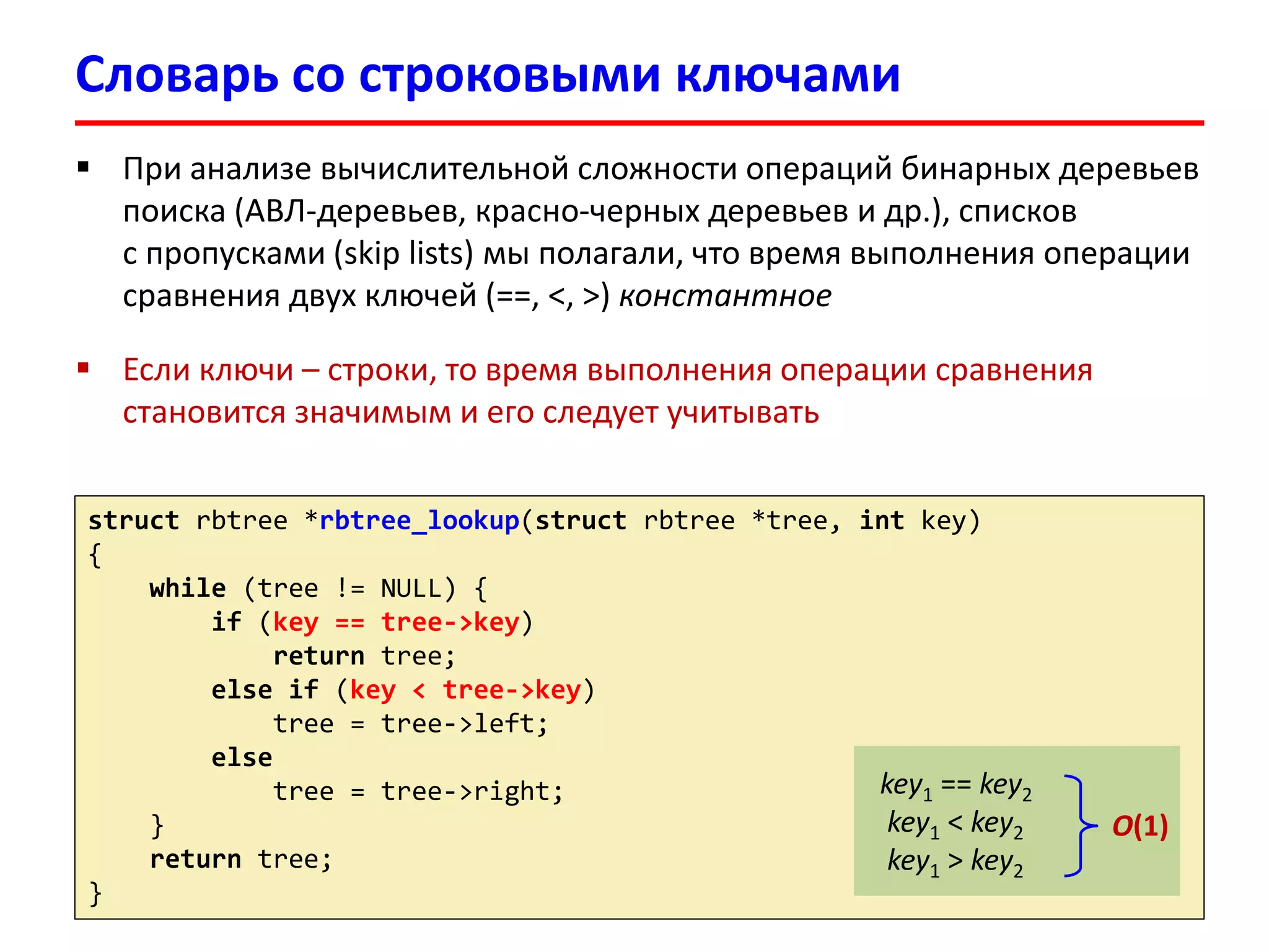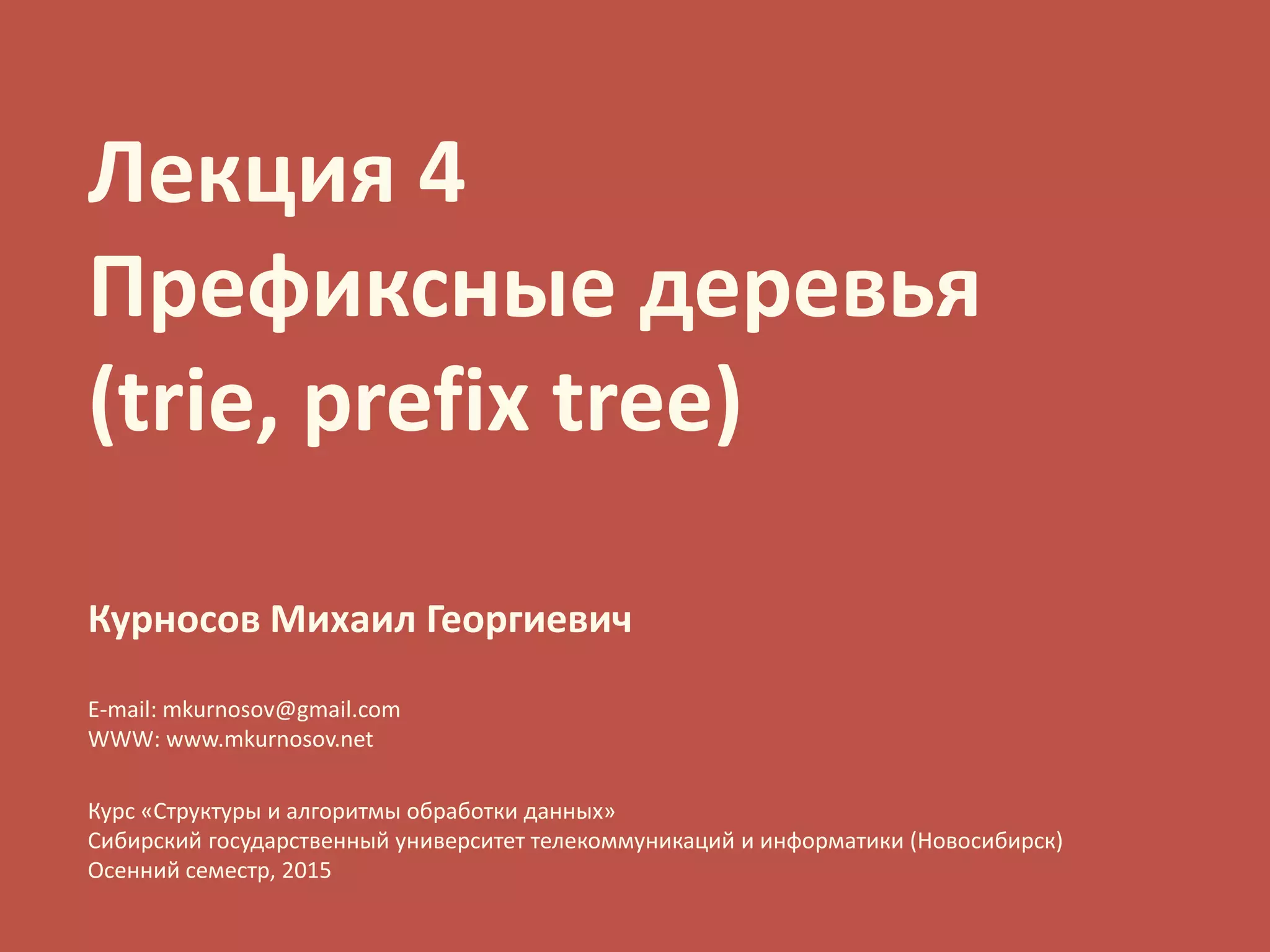 Документ содержит материал лекции о префиксных деревьях (trie), описывая их как структуры данных для реализации словарей с строковыми ключами и обсуждая различные операции, такие как вставка, поиск и удаление элементов. Лекция включает примеры алгоритмов и кода на языке C для работы с префиксными деревьями, а также упоминает практические применения, такие как автозавершение и проверка правописания. Обсуждаются реализации ключей, значения, эффективность операций и сложности алгоритмов.