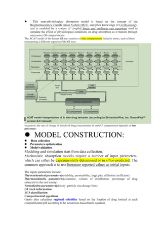 The document discusses the significance of computer-aided biopharmaceutical characterization and in silico absorption models in drug development, highlighting their potential to enhance drug efficacy, reduce costs, and streamline the drug discovery process. It explores various modeling techniques, including dynamic models like the gastroplus and methods of sensitivity analysis, and emphasizes the role of computer simulations in pharmacokinetics and pharmacodynamics for predicting drug behavior. Additionally, it addresses the challenges and advantages of virtual clinical trials and the integration of technological solutions for effective clinical data management.