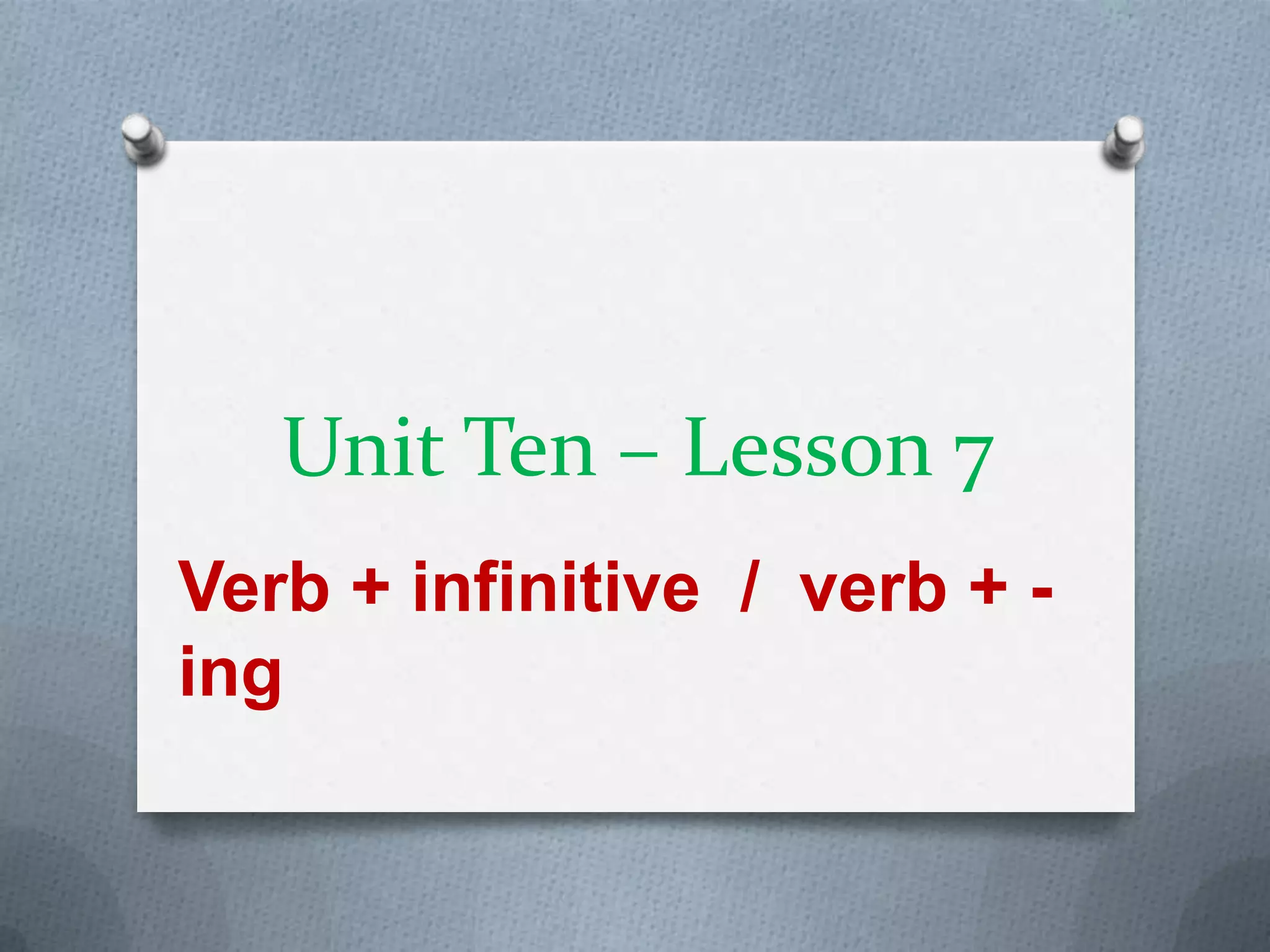The document discusses verbs that are followed by either an infinitive verb form or an "-ing" verb form without changing the meaning. It provides examples of common verbs that take infinitives like "want" and "expect" as well as verbs that take "-ing" forms like "give up" and "enjoy". It also notes some verbs like "start" and "continue" can be followed by either an infinitive or "-ing". The document concludes with a short quote about making new endings.