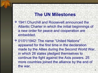 The document outlines the history and development of the United Nations from its origins in 1941 through to modern times. It traces the key milestones in the UN's establishment such as the Atlantic Charter in 1941 and the Declaration by United Nations in 1942. It then discusses the functions and objectives of the UN as laid out in its Charter including the assurance of peace, protection of human rights, economic and social development, and environmental protection. It also describes the main UN bodies like the General Assembly, Security Council, ECOSOC, and their roles. In summary, the document provides a comprehensive overview of the origins and evolution of the UN system from World War 2 to the present day.