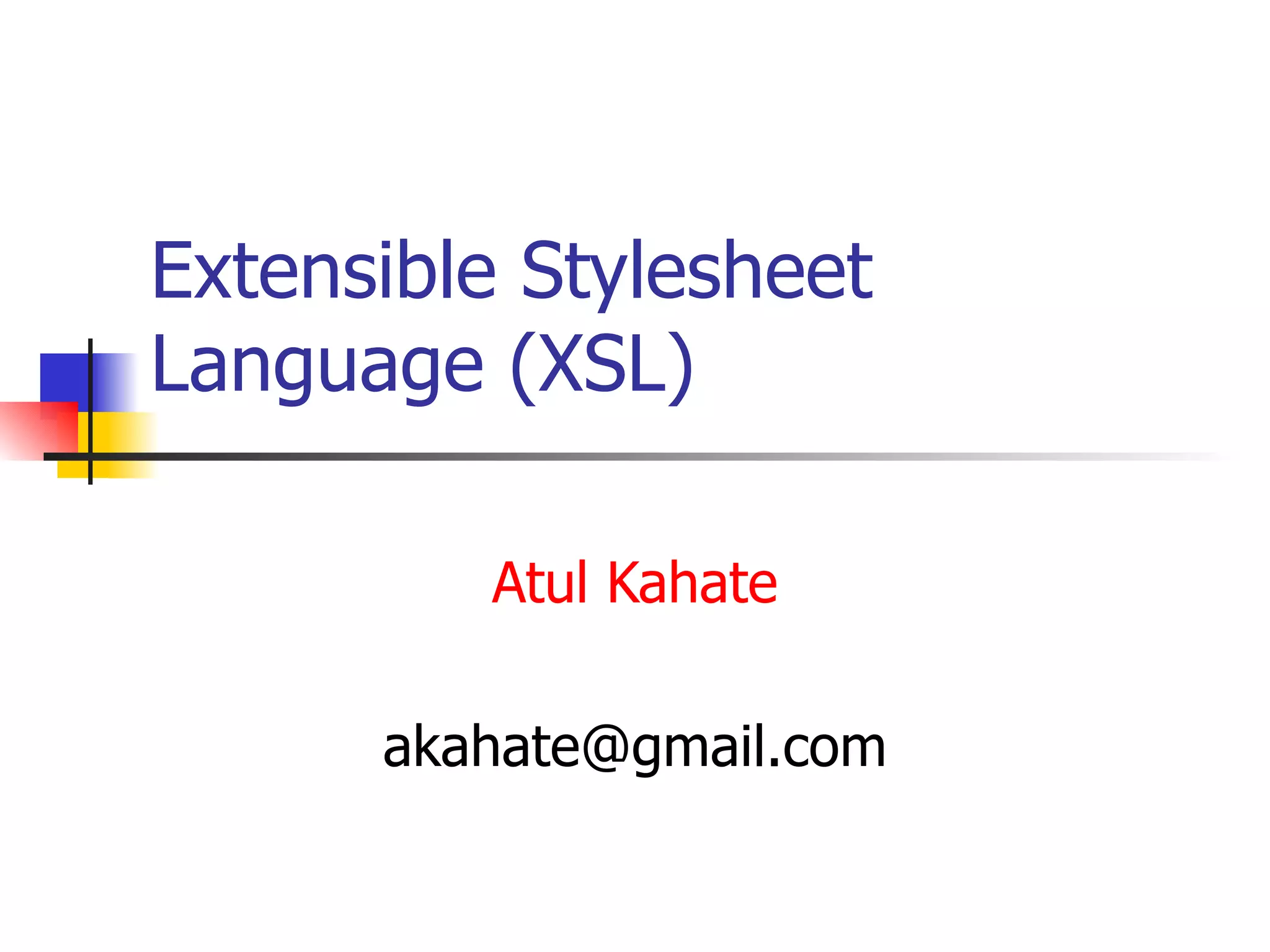 XSL (XML StylesheetLanguage) Two parts XSLT (XSL Transformation) XSL-FO (XSL Formatting Objects) XSLFO is similar to CSS, quite complex We will discuss XSLT in detail, XSL-FO in brief