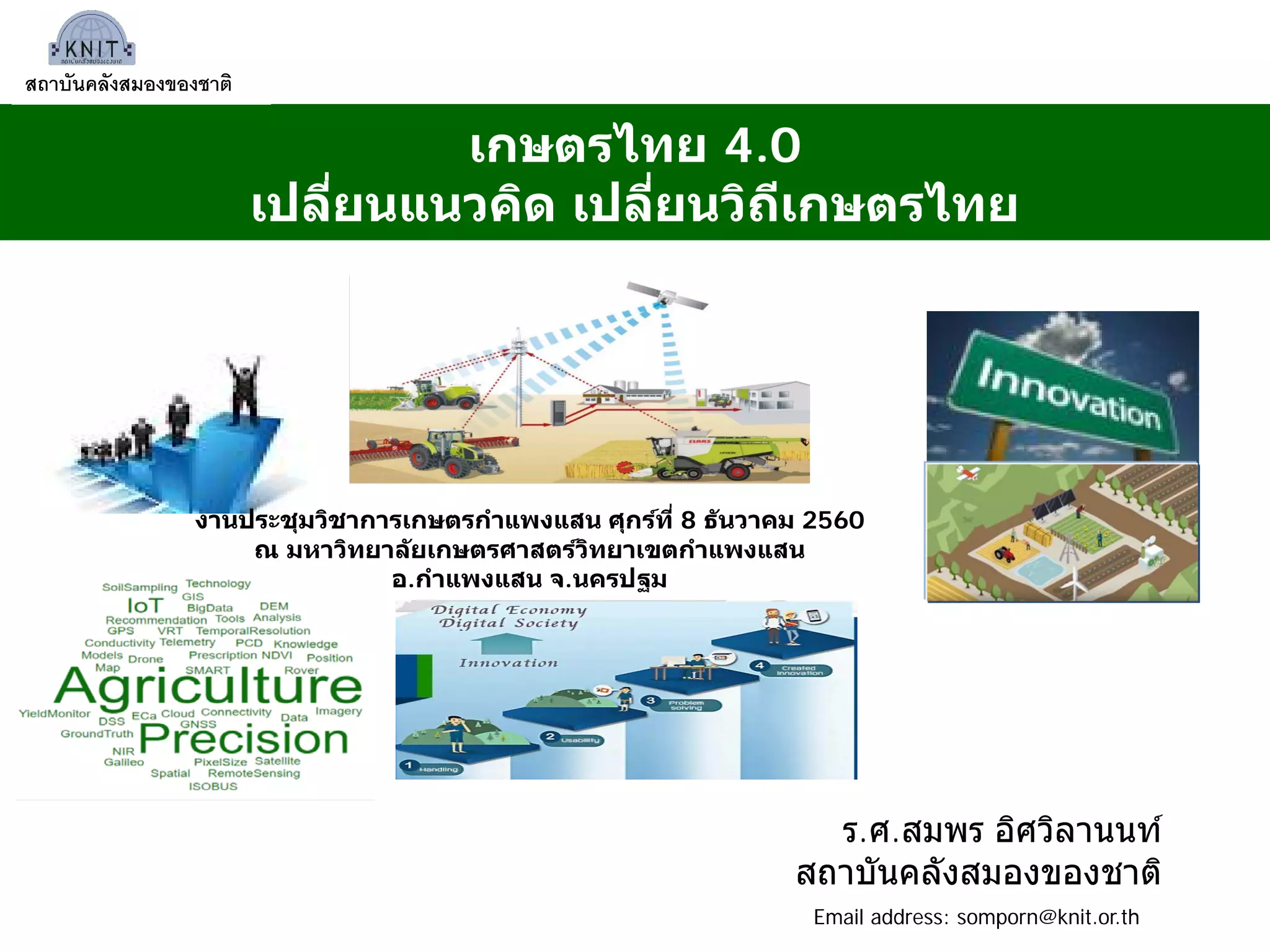 ความจำเป็นของไทยในการขับเคลื่อนภาคการเกษตรด้วยนวัตกรรม การแข่งขันทางการค้าและการแพร่ขยายของดิจิทัลเทคโนโลยีเป็นแรงกดดันให้เกิดการเปลี่ยนแปลงในภาคส่วนเศรษฐกิจต่างๆ ก่อให้เกิดความคิดริเริ่มใหม่และการปรับตัว เทค เทคโนโลยีดิจิทัลในภาคเกาตรนำไปสุ่โอกาสทางการผลิตและการตลาดรูปแบบใหม่ๆ มีการจัดการที่นำไปสุู่การสร้างความจำเพาะในกระบวนการผลิตและหารพัฒนาห่วงโซ่อุปทานสินค้า รูปแบบของเทคโนโลยัและนวัตกรรมในกระบวนการผลิตจะมีลักษณะเป็นการประหยัดต้นทุน การประหยัดการขนส่ง แต่เพิ่ม dimension ในเชิงคุณค่าและมูลค่า รวมถึงคุณภาพของสินค้า ทำให้รูปแบบการค้าสินค้าเกษตรปรับตัวสู่การค้า online และ e-commerce มากขึ้น เกิดผู้ประกอบการยุคใหม่และการเกิดขึ้นของ smart farm