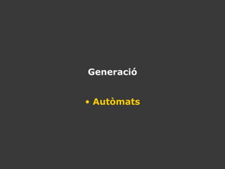 AD 40. Generació: antecedents 1. 2. 3. 4. 5. 6. 7. 8. 9. 10. 11. 12. 13. 14. 15. 16. 17. 18. 19. 20. Wasili Kandinsky (1866-1944) "Punt i línea sobre el pla" "L’espiritual en l’art" Col·laboracions amb Scriabin i Schönberg 21. 22. 23. 24. 25. Oskar Fischinger (1900-1967) Efectes especials amb Fritz Lang Anys 30: Estudis Sons sintètics La música de la llum “Música-llum-color” (1925) amb Moholy-Nagy “Composició en blau” Films absoluts 26. 27. “ Large refraction” (Oskar Fischinger, 1962) Lumigraph Pintures “ Triangular Planes” (Oskar Fischinger, 1949) 28. Norman McLaren 1943: National Film Board of Canada departament d'animació traveling permanent metamorfosi continua pintura directa estereoscopia filmació fotograma a fotograma “ Neighbors" (oscar 1951) abstracció música visual 29. 30. "Pas de deux" (Norman McLaren, 1967) "L'animació no és l'art de moure dibuixos, sinó l'art del dibuix del moviment" 31.