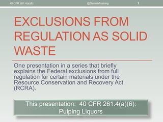 The document discusses federal exclusions from solid waste regulation under the Resource Conservation and Recovery Act, specifically focusing on pulping liquors (black liquor) that are reclaimed in a recovery furnace and reused in the pulping process. It emphasizes that these materials are not considered solid waste unless accumulated speculatively or recycled by other methods. Additionally, it advises checking state regulations as they may differ from federal exclusions.