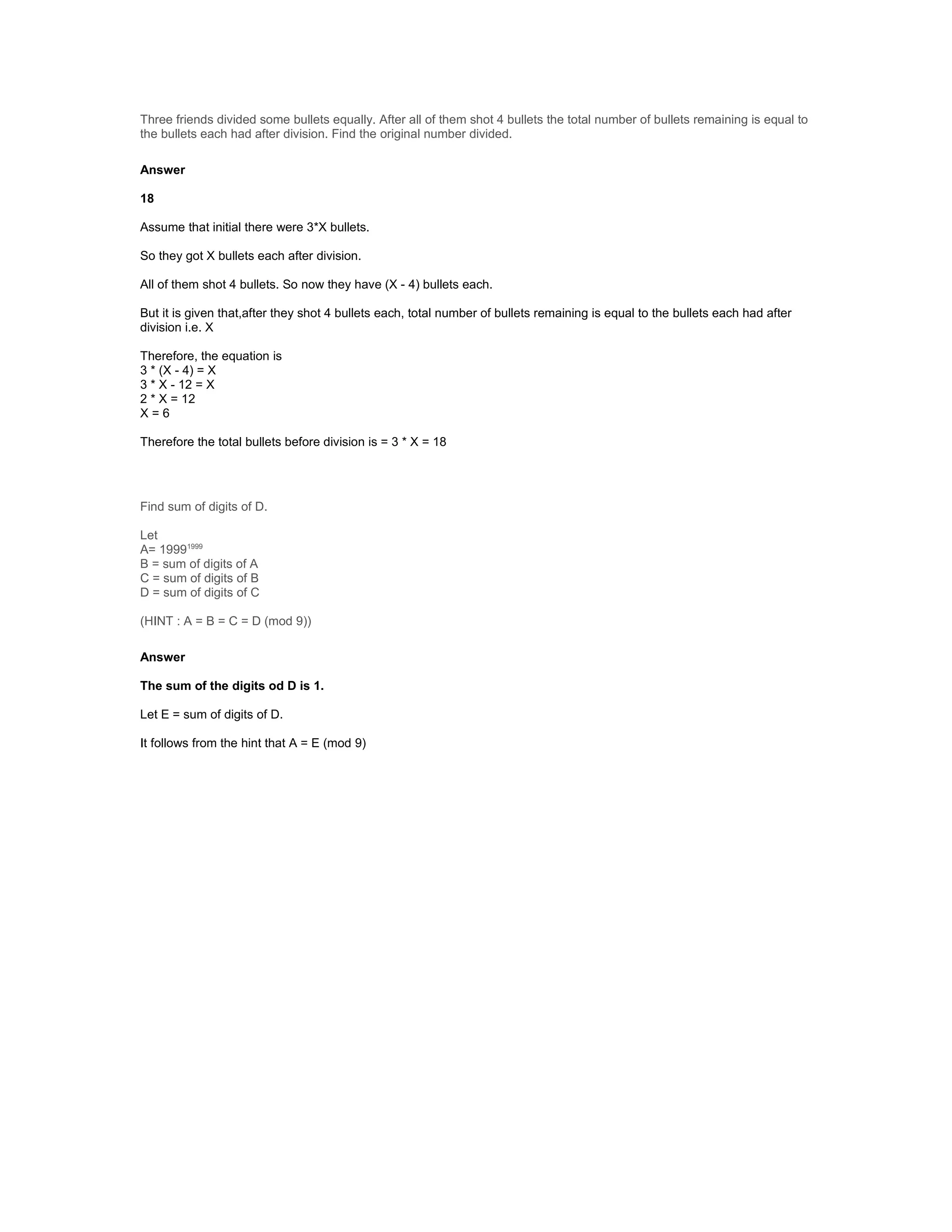 The document describes a math problem involving dividing bullets equally among three friends and determining the original number divided based on information about how many bullets remained after each friend shot 4 bullets. The assistant provides the step-by-step working and determines that the original number of bullets divided was 18.