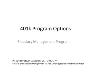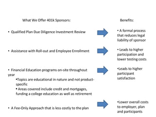 The document outlines a 401k program designed for sponsors, providing fiduciary management, investment reviews, and financial education services. It highlights the benefits of a fee-only approach, including reduced legal liability, higher participation rates, and lower costs for employers and participants. Additionally, the document details various costs associated with the program, options for investment, and services available to participants.