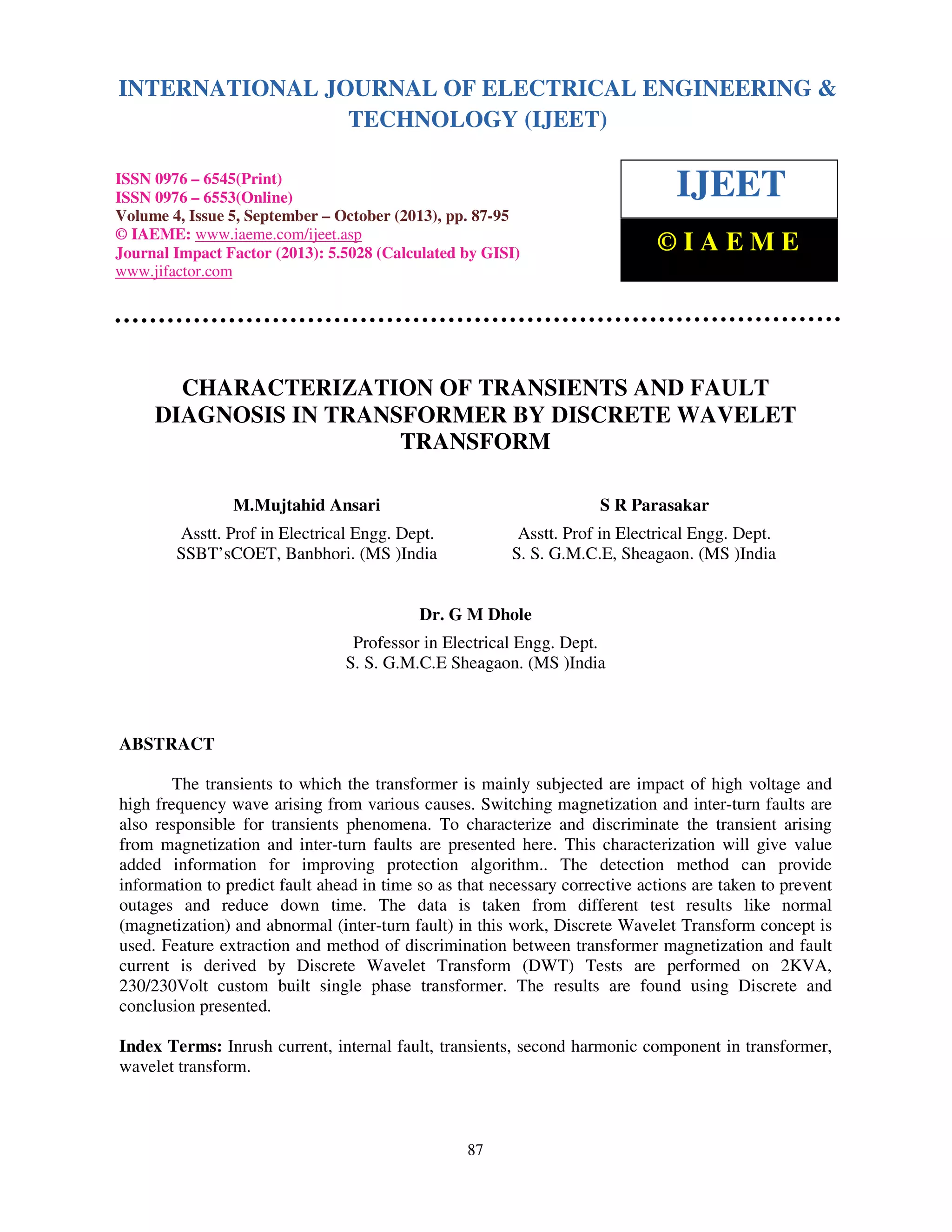 This document summarizes research using discrete wavelet transform (DWT) to characterize transients and diagnose faults in transformers. DWT is used to extract features from transformer current data during normal magnetization and abnormal inter-turn faults. This allows discrimination between the two conditions. Tests were performed on a 2KVA single-phase transformer. Results found DWT can provide information to predict faults in advance to prevent outages and reduce downtime.
