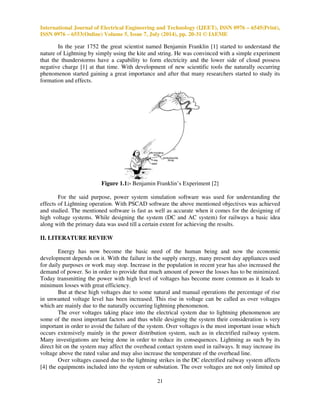 The document discusses the impact of lightning-induced overvoltages on electrified AC and DC railway transmission lines, emphasizing the importance of protection devices like surge arresters. Using PSCAD/EMTDC software, the research examines how lightning affects railway overhead lines and equipment, demonstrating the need for protective measures to prevent damage from transient overvoltages. The findings indicate that surge arresters significantly reduce the risk of equipment failure due to lightning strikes.