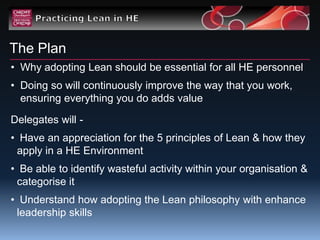 The document discusses adopting Lean principles to improve leadership skills. It outlines the five principles of Lean: identify customers and specify value, identify and map the value stream, create flow by eliminating waste, respond to customer pull, and pursue perfection. Adopting Lean will help continuously improve work and ensure everything adds value. Delegates will learn about the principles, identify wasteful activities, and understand how Lean enhances leadership. Examples show how Lean reduced time, failure demand, and increased capacity and satisfaction at Cardiff University. Personal reflection encourages starting small and thinking big to implement sustained change.