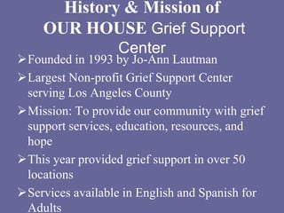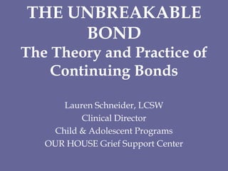 This document discusses the theory of continuing bonds, which posits that maintaining a connection to a deceased loved one is an important part of the grieving process. It provides a historical overview of how views of grief have evolved from encouraging severing bonds in the early 20th century to more modern perspectives that support ongoing connections. Research on child grief indicates that children understand death yet still seek to locate, experience, reach out to and remember the deceased through activities and objects that help them sustain the relationship.