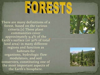The document discusses different types of forests found around the world, including tropical rainforests, tropical deciduous forests, thorn forests, mangrove forests, and coniferous forests. It provides details on the climate, vegetation, and geographic distribution of each forest type. It also discusses the importance of forests in providing habitat for biodiversity and notes some threats to forests from human activities.