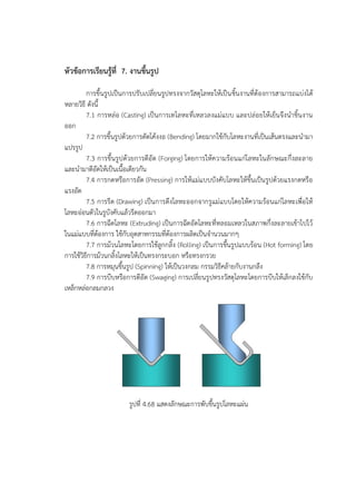 ดังนี้ 7.1 การหล่อ (Casting) เป็นการเทโลหะที่เหลวลงแม่แบบ และปล่อยให้เย็นจึงนาชิ้นงาน ออก 7.2 การขึ้นรูปด้วยการดัดโค้งงอ (Bending) โดยมากใช้กับโลหะงานที่เป็นเส้นตรงและนามา แปรรูป 7.3 การขึ้นรูปด้วยการตีอัด (Forging) โดยการให้ความร้อนแก่โลหะในลักษณะกึ่งละลาย และนามาตีอัดให้เป็นเนื้อเดียวกัน 7.4 การกดหรือการอัด (Pressing) การให้แม่แบบบังคับโลหะให้ขึ้นเป็นรูปด้วยแรงกดหรือ แรงอัด 7.5 การรีด (Drawing) เป็นการดึงโลหะออกจากรูแม่แบบโดยให้ความร้อนแก่โลหะเพื่อให้ โลหะอ่อนตัวในรูบังคับแล้วรีดออกมา 7.6 การฉีดโลหะ (Extruding) เป็นการฉีดอัดโลหะที่หลอมเหลวในสภาพกึ่งละลายเข้าไปไว้ ในแม่แบบที่ต้องการ ใช้กับอุตสาหกรรมที่ต้องการผลิตเป็นจานวนมากๆ 7.7 การม้วนโลหะโดยการใช้ลูกกลิ้ง (Rolling) เป็นการขึ้นรูปแบบร้อน (Hot forming) โดย การใช้วิธีการม้วนกลิ้งโลหะให้เป็นทรงกระบอก หรือทรงกรวย 7.8 การหมุนขึ้นรูป (Spinning) ให้เป็นวงกลม กรรมวิธีคล้ายกับงานกลึง 7.9 การบีบหรือการตีอัด (Swaging) การเปลี่ยนรูปทรงวัสดุโลหะโดยการบีบให้เล็กลงใช้กับ เหล็กหล่อกลมกลวง รูปที่ 4.68 แสดงลักษณะการพับขึ้นรูปโลหะแผ่น