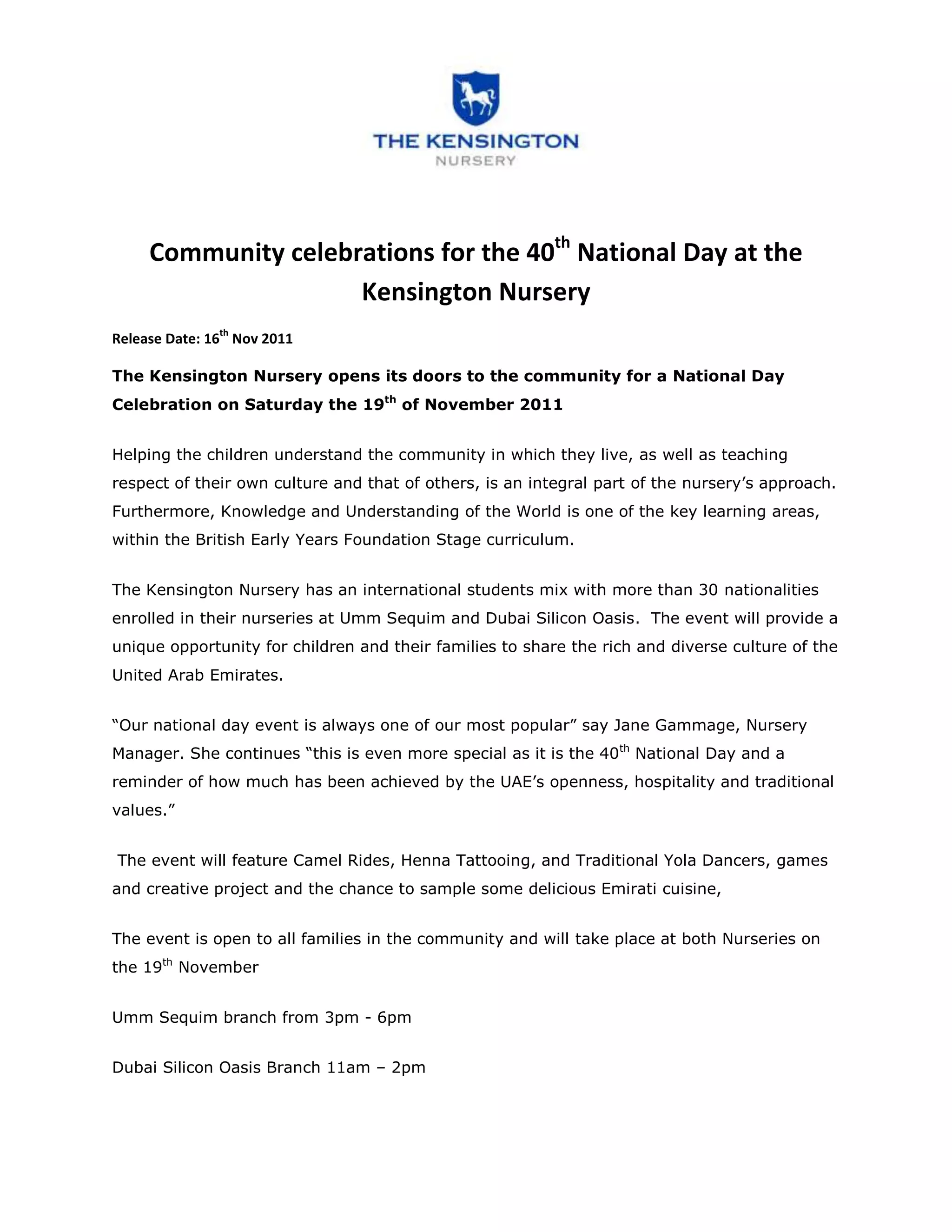 The Kensington Nursery is celebrating the 40th UAE National Day with events open to the community on November 19th. The events at the Umm Sequim and Dubai Silicon Oasis locations will feature camel rides, henna tattooing, dancing, games, arts and crafts, and Emirati cuisine. With over 30 nationalities represented, the celebrations will provide an opportunity for children and families to learn about Emirati culture and share in the diversity of the UAE.