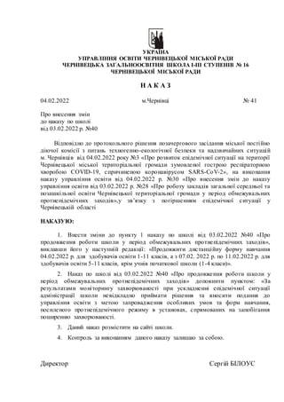 2. Наказ по школі від 03.02.2022 №40 «Про продовження роботи школи у