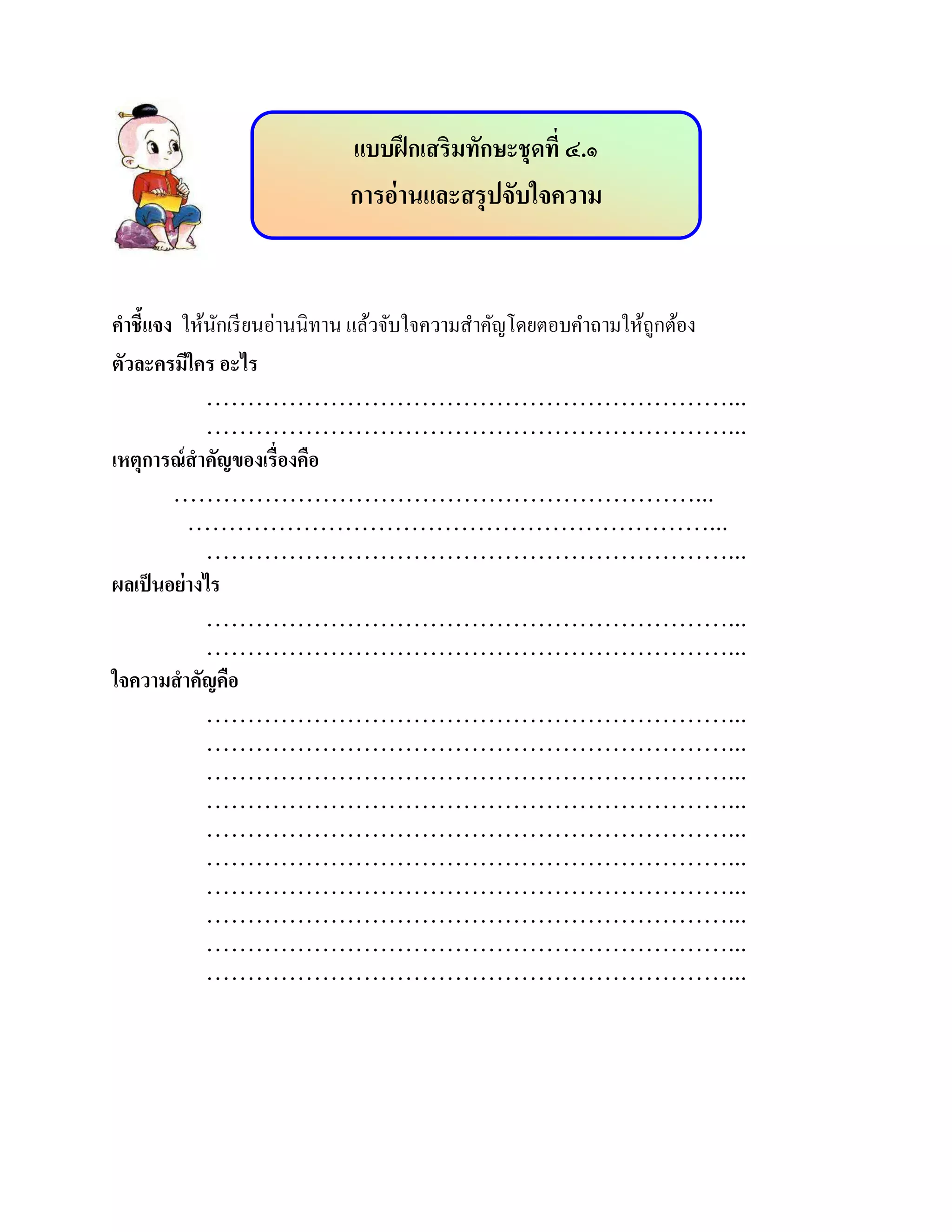 อะไร ………………………………………………………... ………………………………………………………... เหตุกำรณ์สำคัญของเรื่องคือ ………………………………………………………... ………………………………………………………... ………………………………………………………... ผลเป็นอย่ำงไร ………………………………………………………... ………………………………………………………... ใจควำมสำคัญคือ ………………………………………………………... ………………………………………………………... ………………………………………………………... ………………………………………………………... ………………………………………………………... ………………………………………………………... ………………………………………………………... ………………………………………………………... ………………………………………………………... ………………………………………………………... แบบฝึกเสริมทักษะชุดที่ ๔.๑ กำรอ่ำนและสรุปจับใจควำม