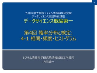 1 九州大学大学院システム情報科学研究院 データサイエンス実践特別講座 データサイエンス概論第一 第4回 確率分布と検定: 4-1 相関・頻度・ヒストグラム システム情報科学研究院情報知能工学部門 内田誠一
