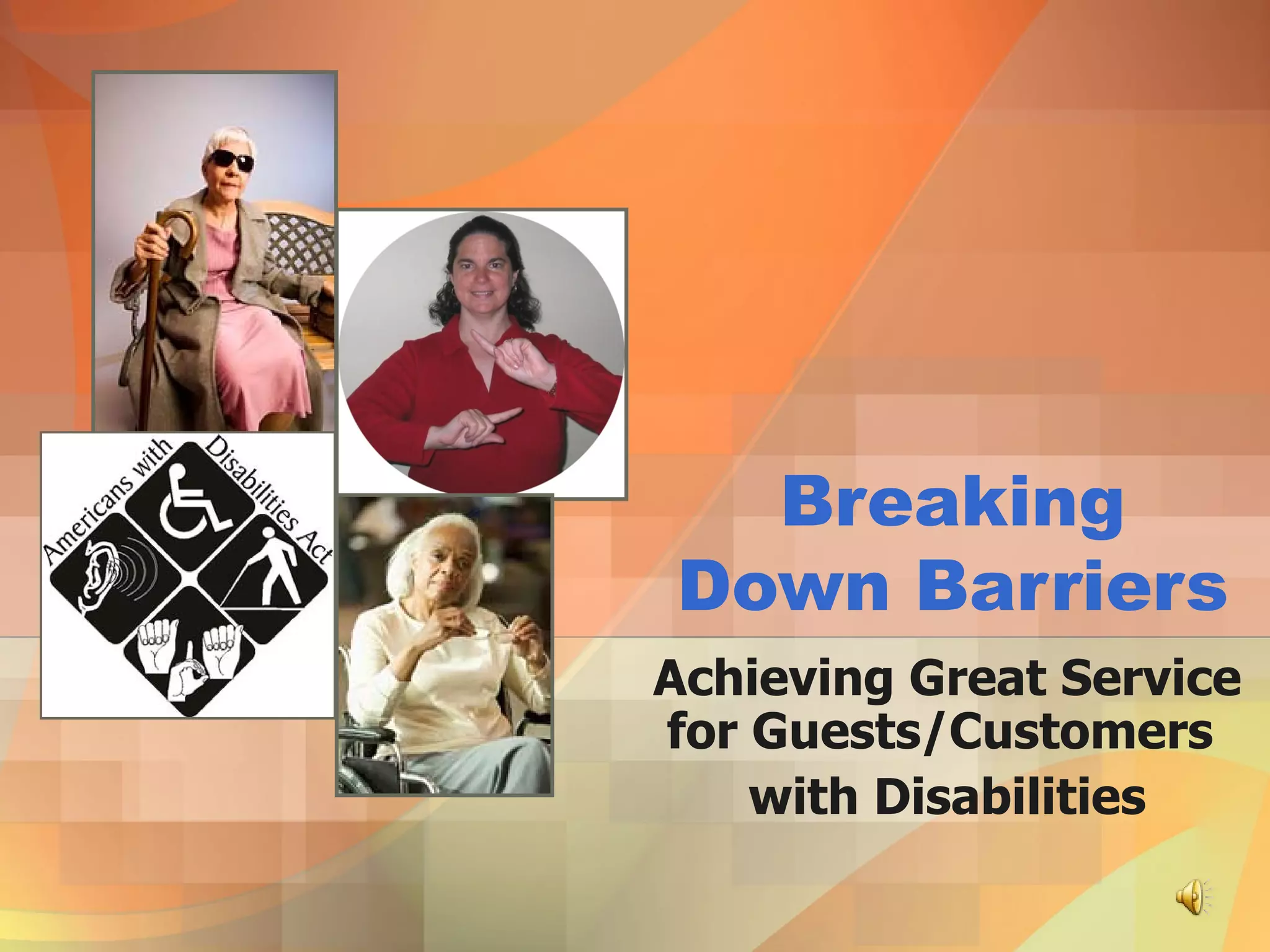 This document provides guidance on serving guests with disabilities by defining key terms, describing appropriate interactions, and guidelines for specific disabilities. The main points are: