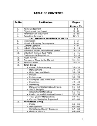 This document provides an overview of the two-wheeler industry in India. It begins with an introduction to the industry, historical development, and current state. The major players are identified as Bajaj Auto, Hero Honda, Kinetic, LML and TVS Motors. In recent years, the motorcycle segment has grown most rapidly, increasing its market share from 37% to nearly 70% currently. The objectives and parameters of the project are outlined, focusing on analyzing industry structure, major players, and their strategies through areas of management. An executive summary provides high-level details on industry trends, including increased competition leading to pricing pressures and reduced margins unless offset by volume growth.