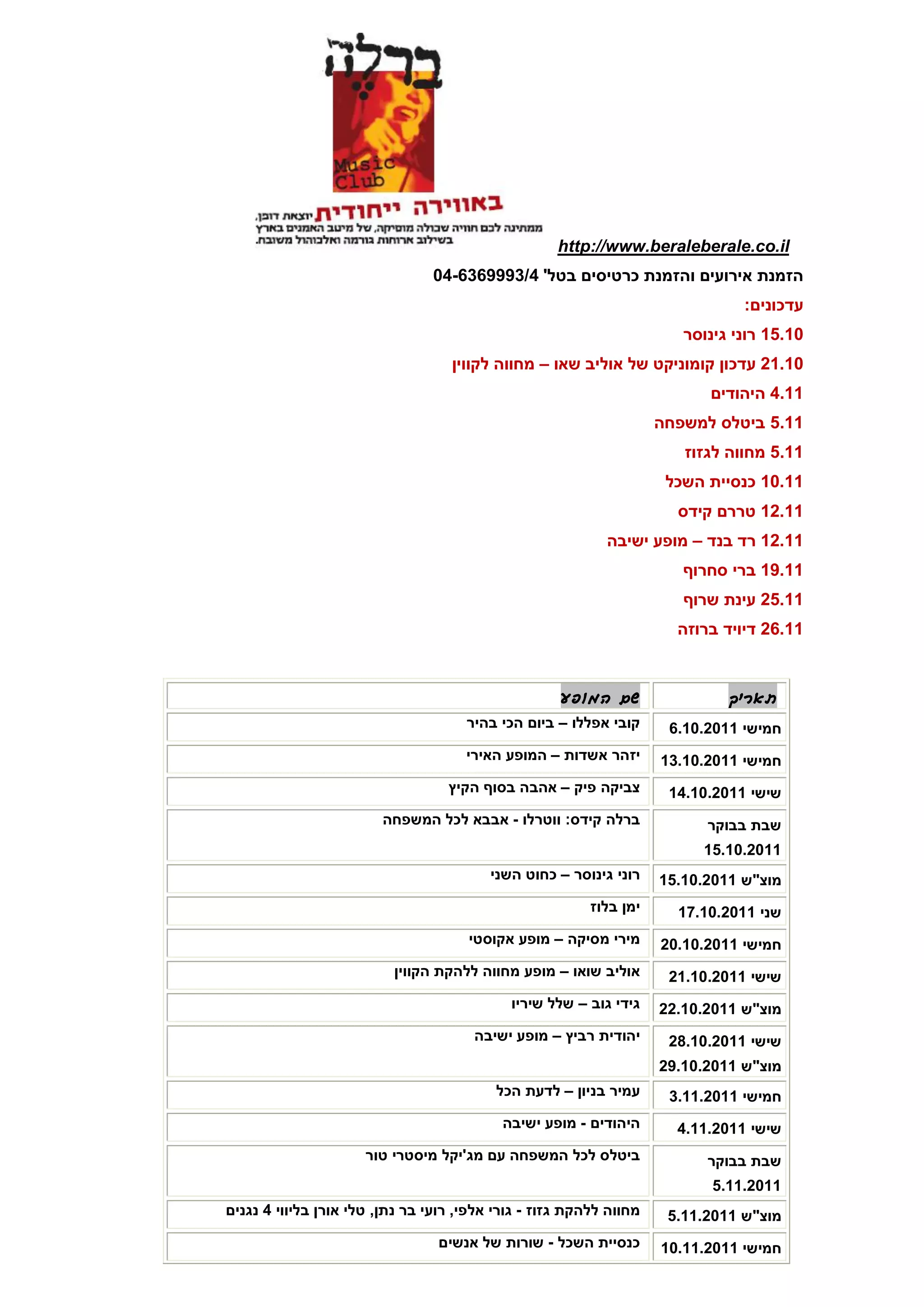 שישי 1102.11.4 היהודים - מופע ישיבה, פתיחת דלתות 00:12, תחילת המופע