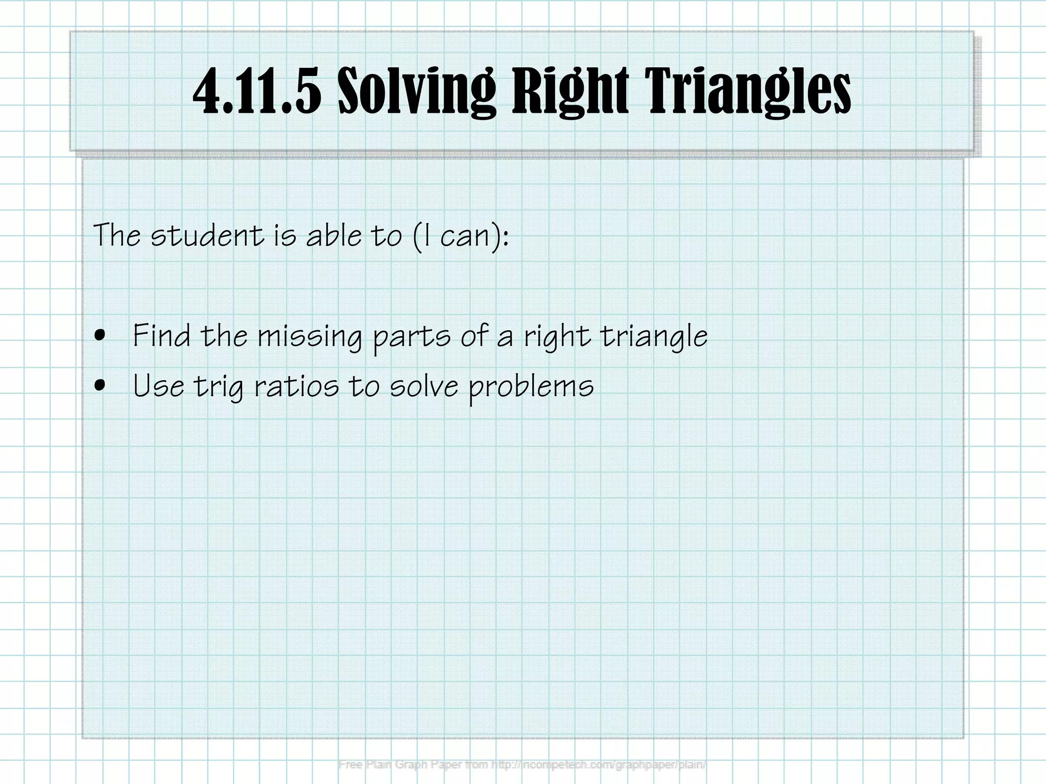 This document provides instructions for solving right triangles. It explains that to solve a right triangle, you find all the missing parts. If given an angle and side, you can use trig ratios to find the other acute angle and missing sides. If given two sides, you can use the Pythagorean theorem to find the missing side and trig ratios to find an angle. It provides examples of solving right triangles when given an angle and side or two sides.