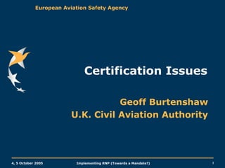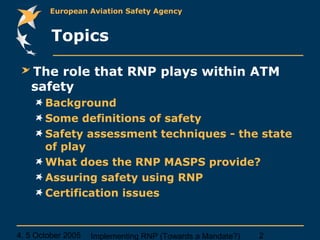 This document discusses issues around implementing required navigation performance (RNP) in aviation. It summarizes the European Aviation Safety Agency's experience with low RNP approvals, noting technical challenges, certification process difficulties, and lessons learned. It also outlines EASA's current rulemaking efforts to develop an advisory circular on airworthiness and operational approval criteria for RNP approaches. Going forward, EASA aims to establish a formal safety methodology relating aircraft capabilities to route spacing and develop airworthiness and operational approval standards for other flight phases.