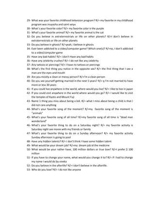 This document summarizes the responses from an interview of a 16-year-old girl named Kerlin/Diana/Johana. Some of her responses include that she lives with her mother, father and sister, her best friend is named Diana, she is afraid of spiders and cockroaches, and her dream job would be medicine. She also notes that her favorite activities include seeing movies with friends and family on Saturday nights and going to the pool on Sunday afternoons.