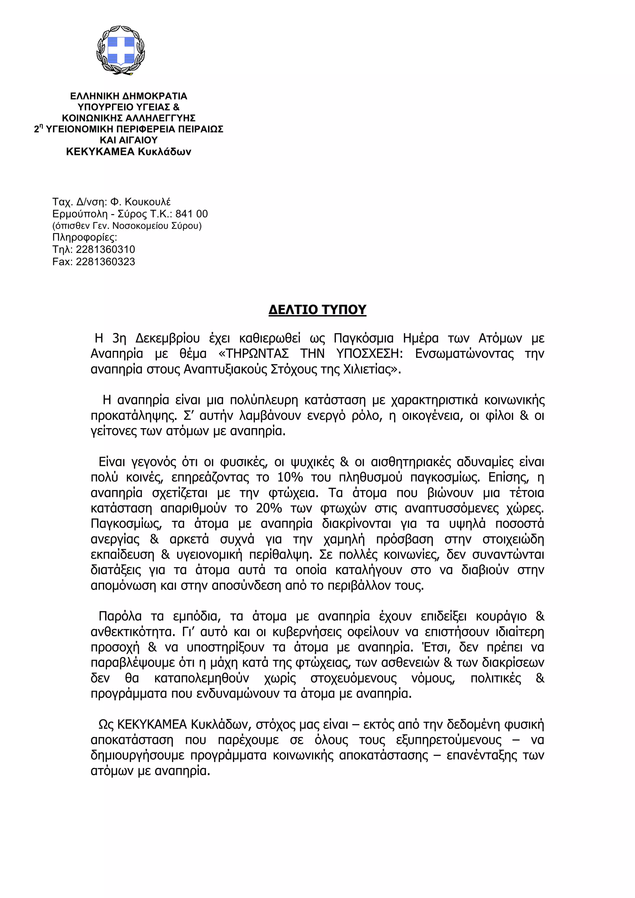 δελτιο τυπου (4.12.2010) παγκόσμια ημέρα των ατόμων με αναπηρία