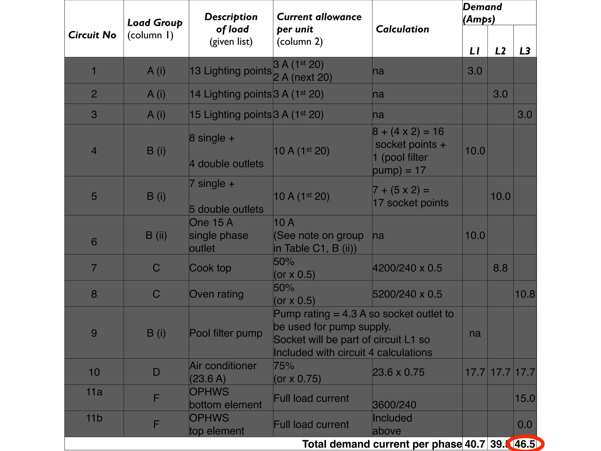 This document summarizes the electrical load calculations for 11 circuits in a home. It lists the load type and description for each circuit, the current allowance per unit, and calculates the demand in amps for circuits 1-10. The largest demands are 17.7 amps for an air conditioner and 15 amps for an off-peak hot water system. The total calculated demand current for each phase is 40.7, 39.5, and 46.5 amps respectively.