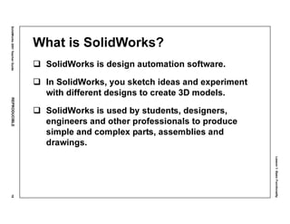 - What SolidWorks is and how it is used to create 3D models through sketching and experimenting with designs.