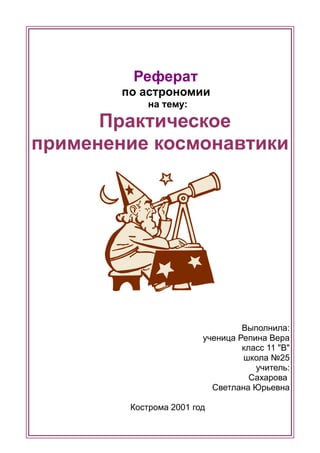 Документ представляет собой реферат по астрономии о практическом применении космонавтики, выполненный ученицей 11 класса. Он охватывает историю космической эры, исследования Венеры и Сатурна, применение космоса в различных науках, а также достижения в области пилотируемых полетов. В документе также описаны ключевые миссии, использовавшие автоматические межпланетные станции, и их вклад в изучение космоса.