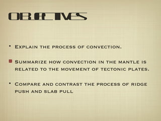 The document discusses convection in the mantle and how it relates to plate tectonics. It explains that convection currents, along with ridge push and slab pull, are responsible for the movement of tectonic plates. Ridge push occurs as new ocean crust is formed at mid-ocean ridges, lifting and pushing the plates apart. Slab pull results from the subduction of ocean plates at trenches, where cooling slabs pull the plates into the mantle.