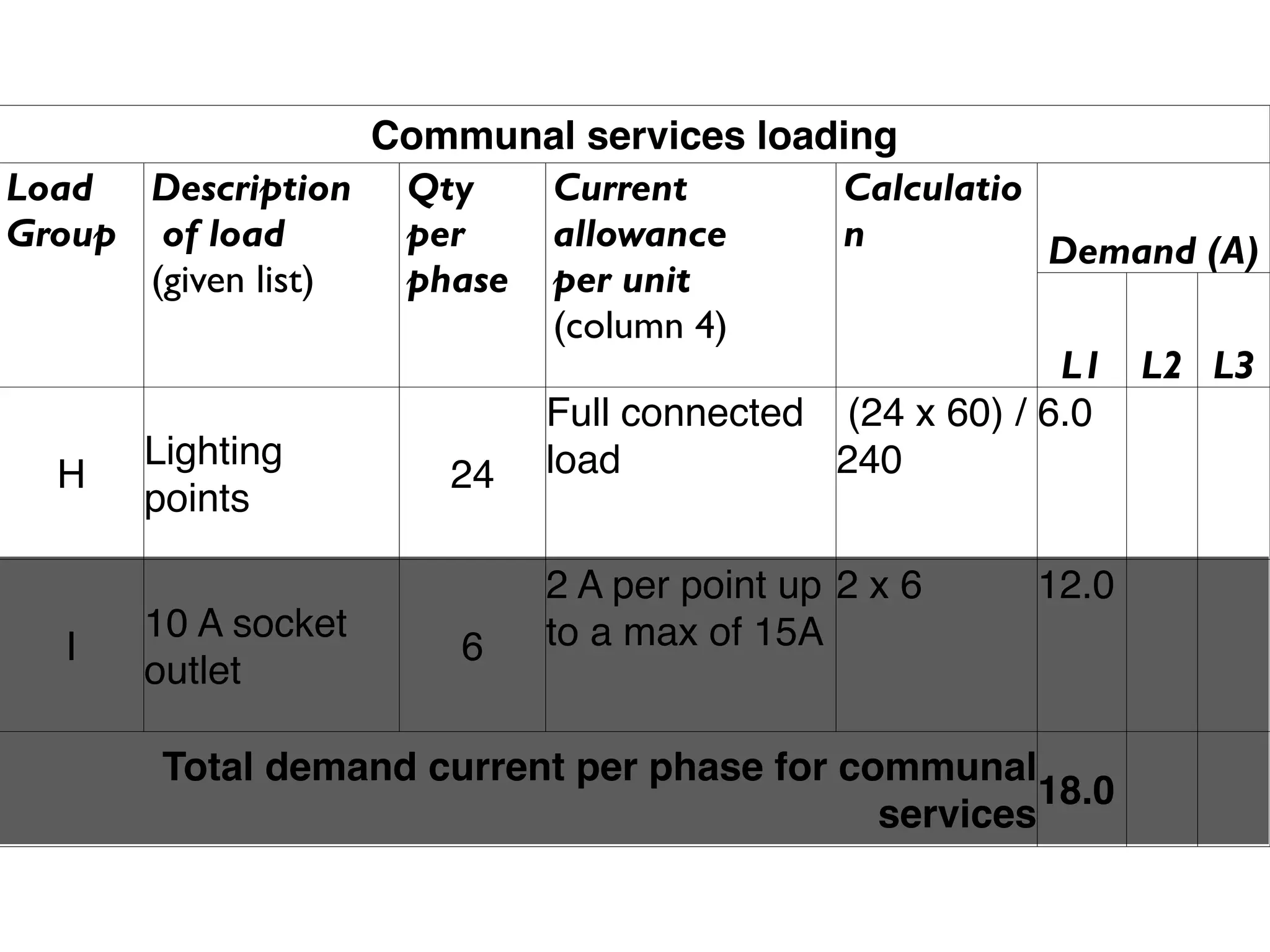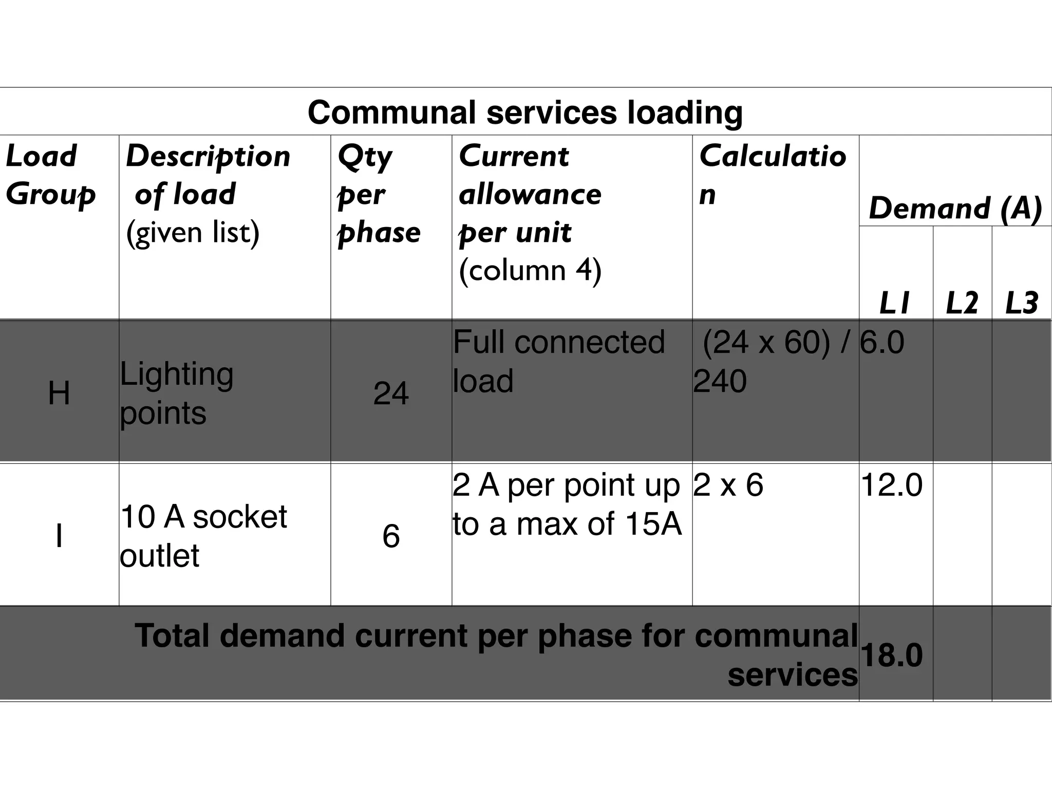 The document calculates the electrical load of communal services in an apartment building. It shows that 24 lighting points will draw 240 watts and 6 10A sockets will draw up to 12A, for a total demand of 18A per phase. The total demand current per phase for communal services is 18A.