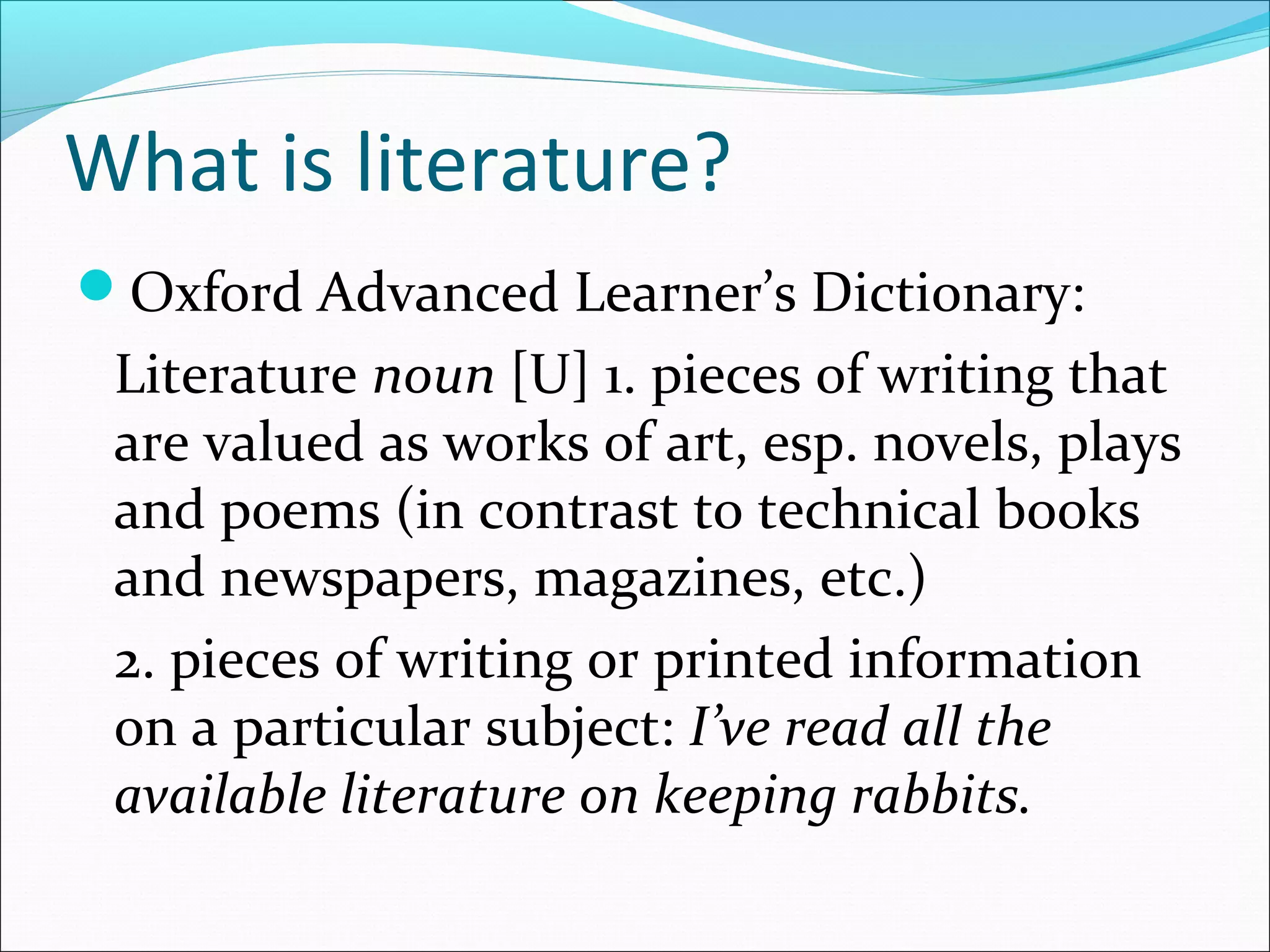 The document defines literature as pieces of writing that are valued as works of art such as novels, plays, and poems, in contrast to technical books and magazines. Literature inspires admiration and emotion in readers over time. It is a means of communicating human concerns through imagination and meaningful expression. Poetry emerges from the interplay between words and their arrangement, using imagery, symbols, and sound features. Reading literature allows experiencing a range of human experiences from different perspectives and is enjoyable, entertaining, and informative.