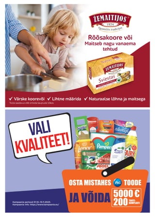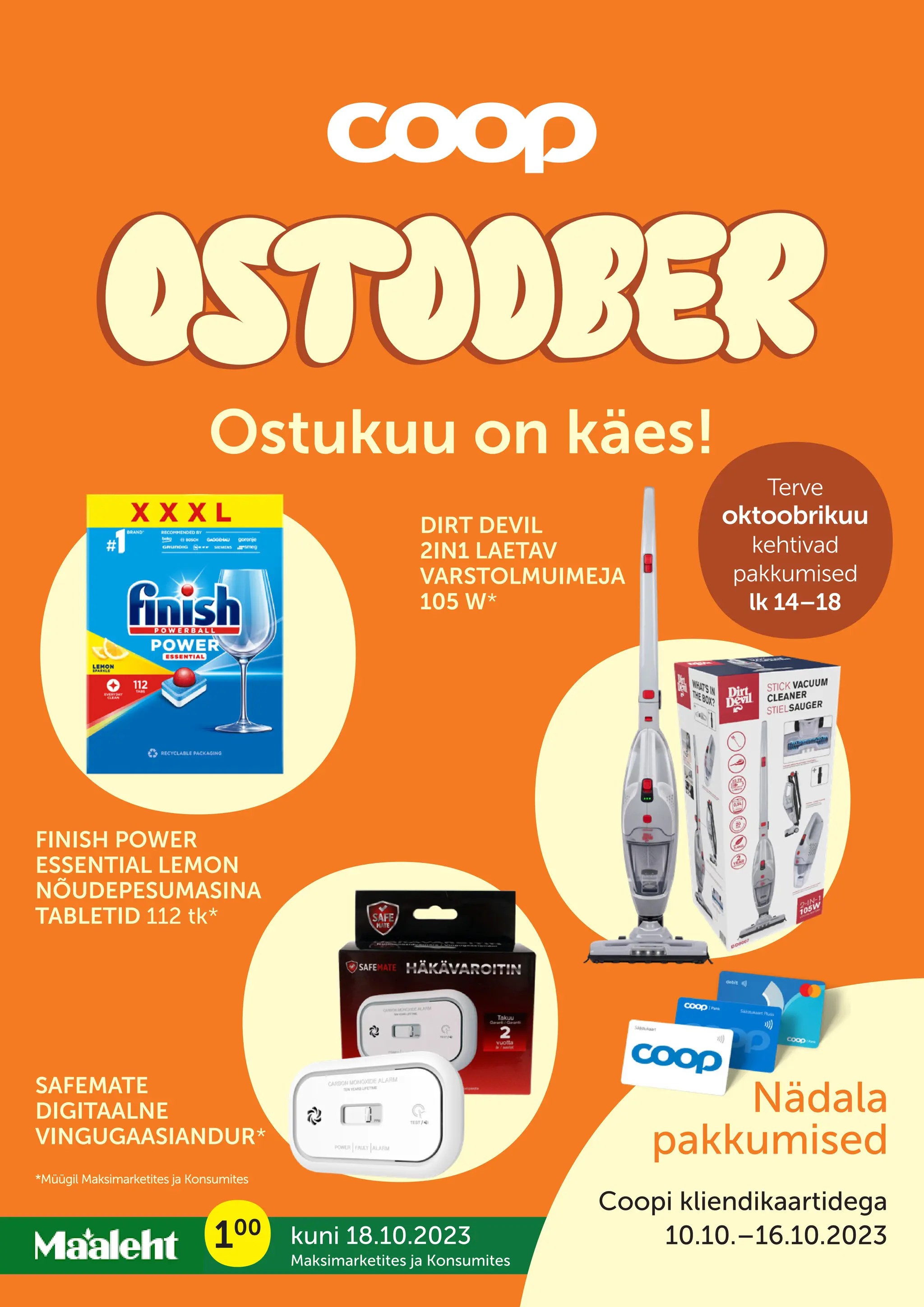 Документ содержит информацию о специальных предложениях и акциях в магазинах Maksi- и Konsum, действующих с 10 по 16 октября 2023 года, включая различные продукты и цены. Указаны подробные расценки на мясные изделия, молочные продукты, напитки и товары для дома, предлагая скидки для держателей карт Coop. Также упоминается информация о регистрации карт и финансовых услугах от Coop Bank.