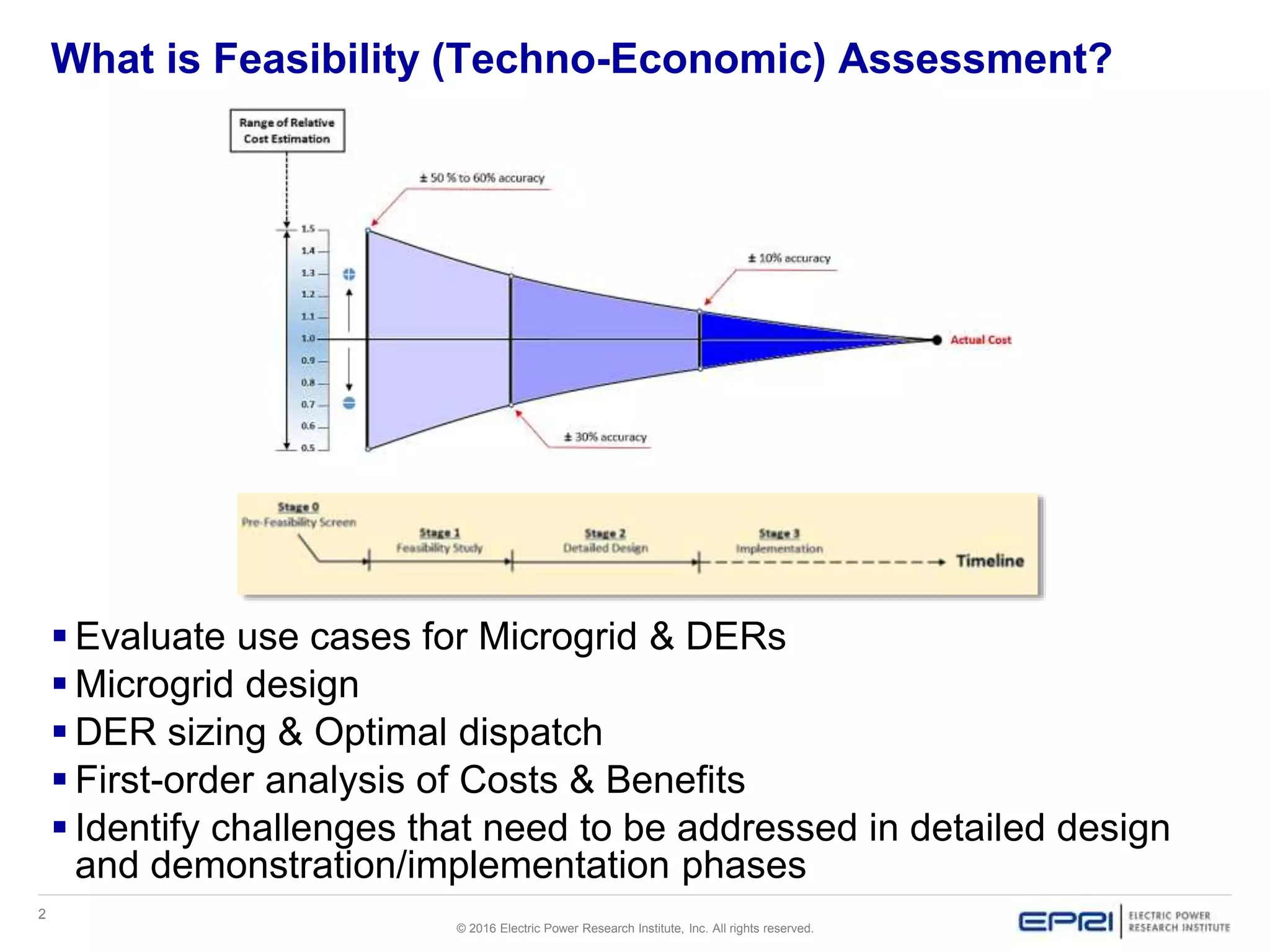The document outlines the techno-economic assessment for microgrids, focusing on design, sizing, and optimal dispatch of distributed energy resources (DER). It highlights the importance of combining technical requirements, cost factors, and policy in the design process while addressing challenges such as optimization limitations and uncertainty management. Various software tools and methodologies are discussed to aid in the feasibility assessment and enhance decision-making in microgrid projects.