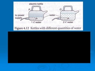 This document contains examples and exercises involving the use of specific heat capacity to calculate changes in temperature of materials when heat is added or removed. It includes 4 examples calculating the final temperature of various materials like iron rods, water, and glass when given the initial temperature, mass, heat added/removed, and specific heat capacities. It then provides context on how specific heat capacities of land and water impact sea and land breezes. Finally, it lists 5 practice exercises for students to calculate temperature changes using specific heat capacity.