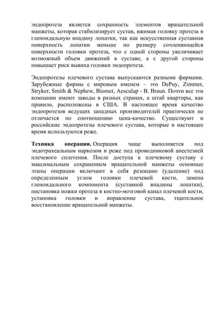 Документ описывает методы тотального эндопротезирования плечевого сустава, включая анатомический и реверсивный эндопротезы. Приведены детали операций, техники установки протезов, возможные осложнения и реабилитация, а также профилактика инфекционных осложнений и выводы по типам свободных и фиксированных имплантатов. Также рассматриваются механизмы лечения и диагностики переломов плечевой кости.