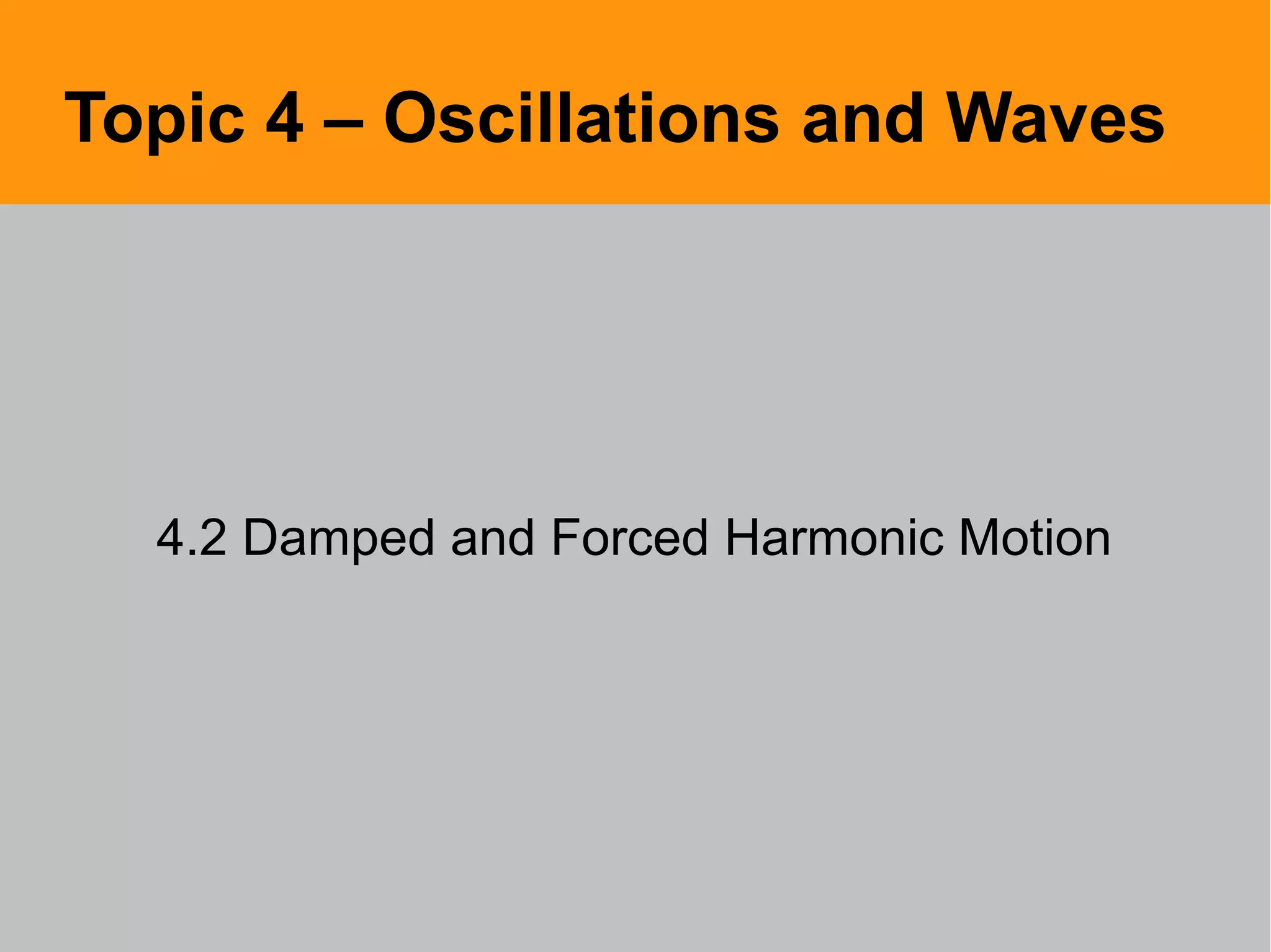 This document discusses damped and forced harmonic motion. It explains that in damped harmonic motion, a damping force acts opposite to the velocity to dissipate energy and stop vibrations. The damping causes the amplitude to decay exponentially over time. A system can be under-damped, over-damped, or critically damped depending on how quickly it stops oscillating. Forced harmonic motion occurs when an external periodic force drives the system, like pushing a swing. At resonance, the driving frequency matches the natural frequency, causing large amplitude oscillations. While resonance can be dangerous if it causes collapse, it can also be useful in applications like radios and musical instruments.
