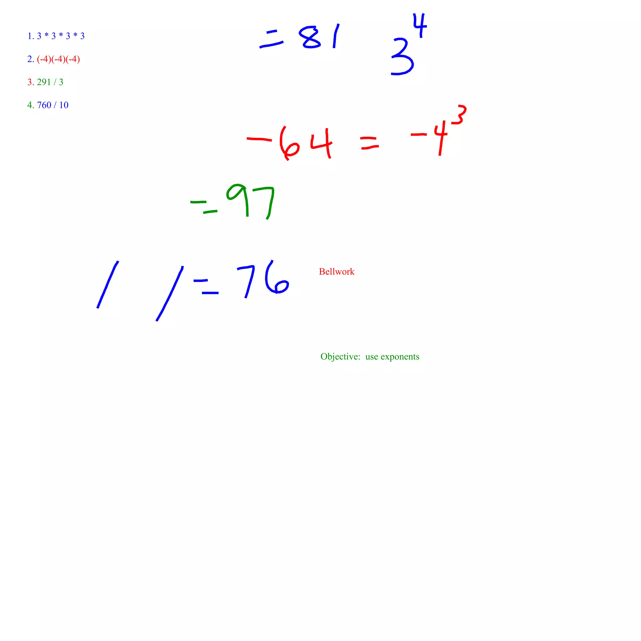 1. 3 * 3 * 3 * 3 = 81 2. (-4)(-4)(-4) = 64 3. 291 / 3 = 97 The objective of the document is to use exponents to simplify expressions and evaluate expressions for given values.