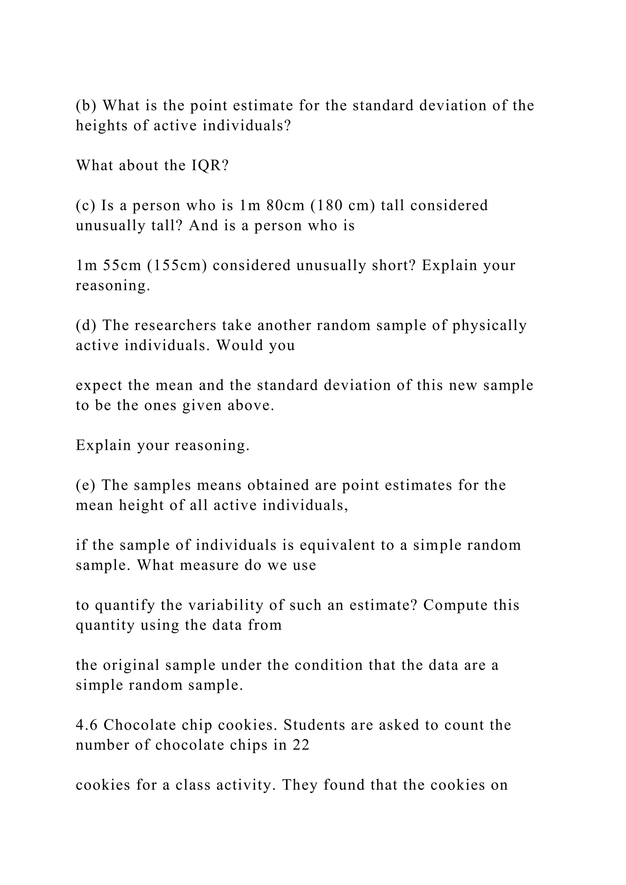 The document discusses the identification of parameters using different scenarios, such as polls and surveys, to determine whether the parameter is a mean or a proportion. It also addresses studies on various topics including heights of adults, consumer spending during holidays, mental health, and hypotheses testing related to different phenomena. The narrative highlights the implications of data collection, analysis, and the need for careful statistical interpretation.
