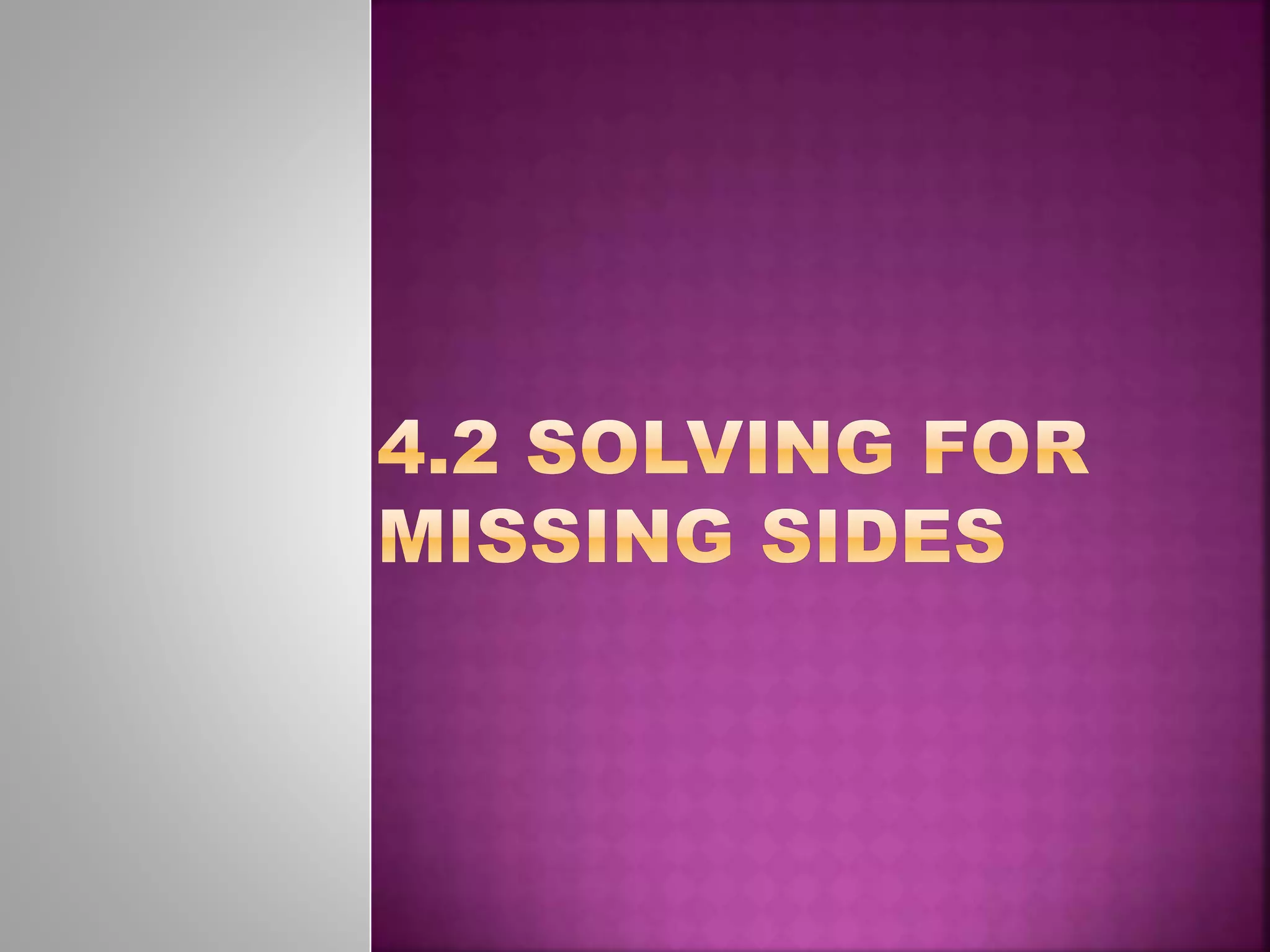 This document provides instructions for solving for a missing side of a triangle using trigonometric functions. It tells the reader to label the sides of the triangle, set up an equation using the information given, and solve for the variable to find the missing side, making sure a calculator is in degree mode.