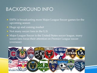 ESPN aims to increase viewership of Major League Soccer (MLS) games by dedicating journalists solely to MLS coverage on social media and generating hashtag campaigns. The document recommends establishing a stronger MLS presence on ESPN's popular homepage by featuring an MLS blog. It also suggests using inbound marketing techniques like an MLS newsletter and notifications on ESPN's homepage to build the subscriber base. Paid advertising strategies include boosting Facebook posts about matchups and running Google AdWords for keywords like "MLS scores". The total monthly budget outlined is $4,572.