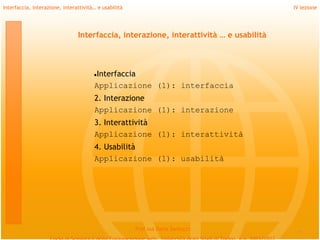 Il documento esplora le fondamenta della progettazione delle interfacce utente, discutendo concetti di interfaccia, interazione e usabilità attraverso linee guida, modelli teorici e pratiche raccomandate. Viene enfatizzata l'importanza della coerenza, del feedback e della conoscenza del destinatario per garantire un'esperienza utente efficace. Inoltre, si sottolinea l'accessibilità per utenti con diverse abilità e la necessità di una manipolazione diretta nelle interazioni con il sistema.